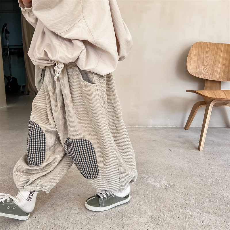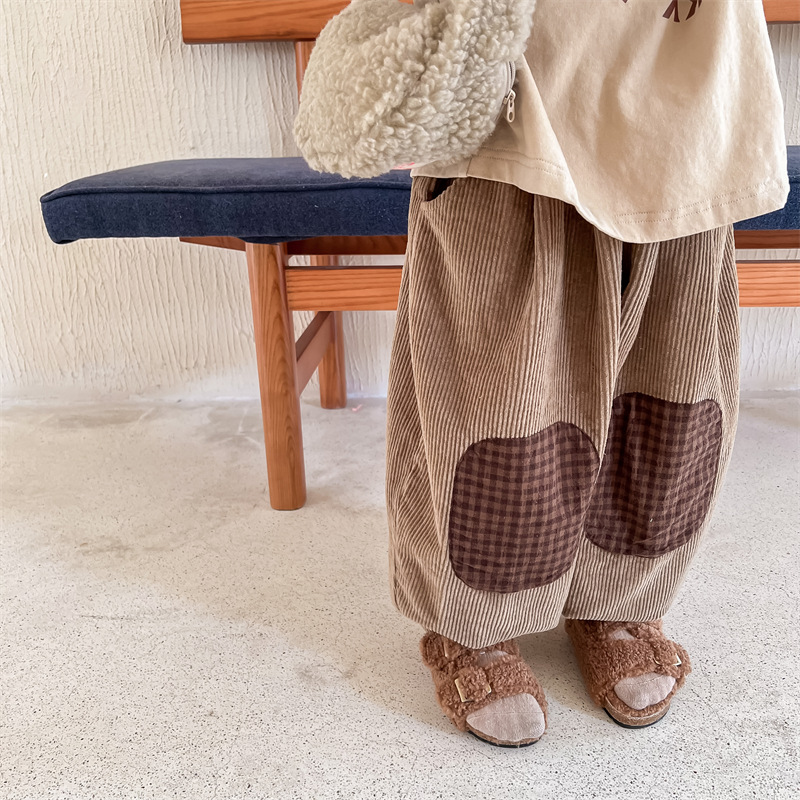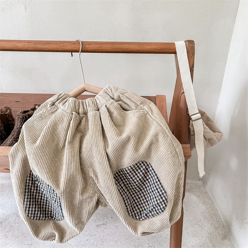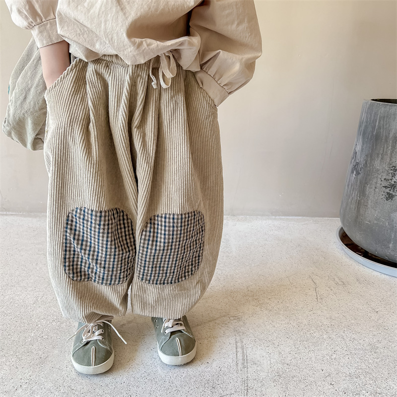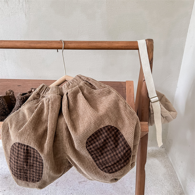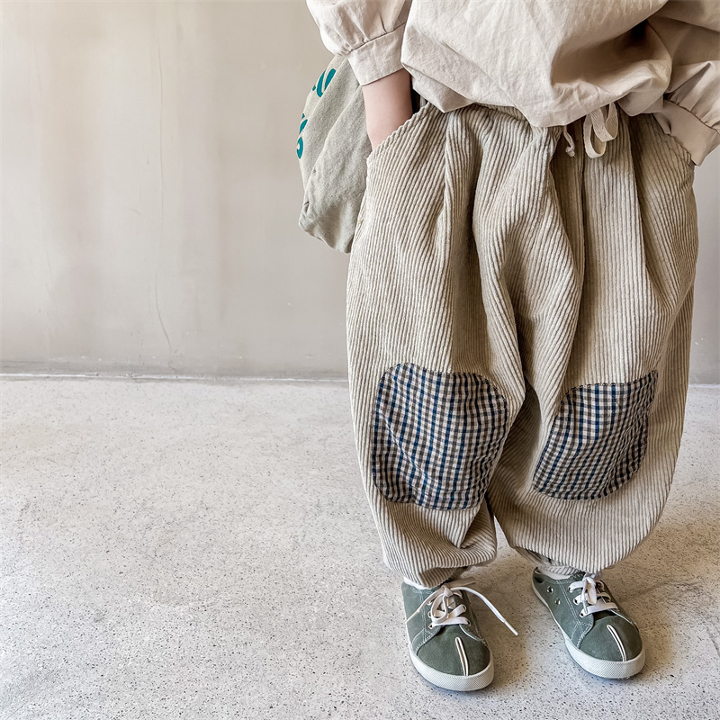 日系格子補丁條絨長褲