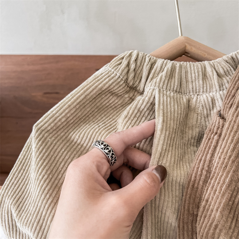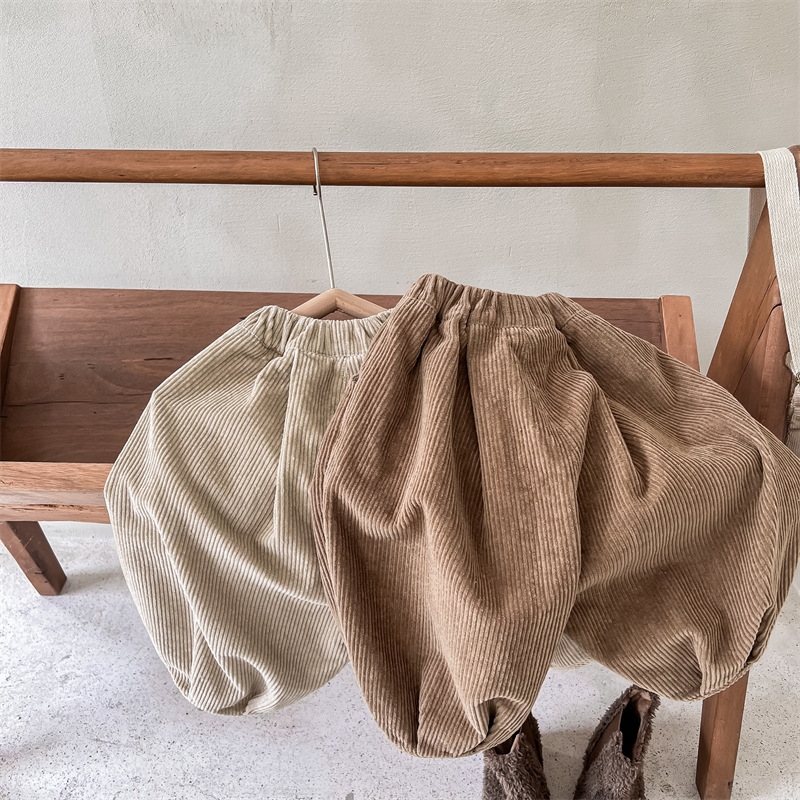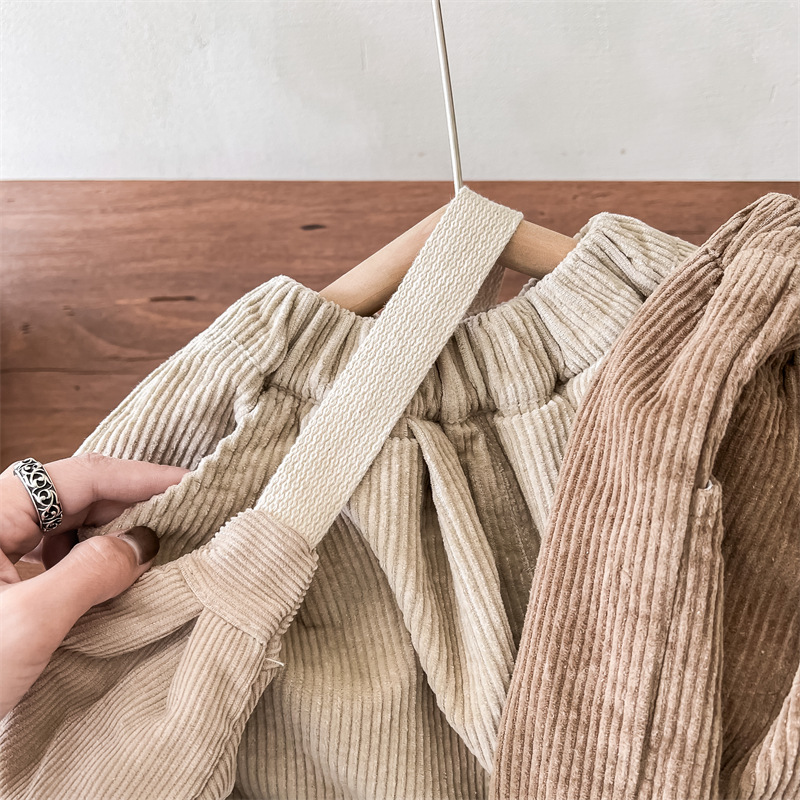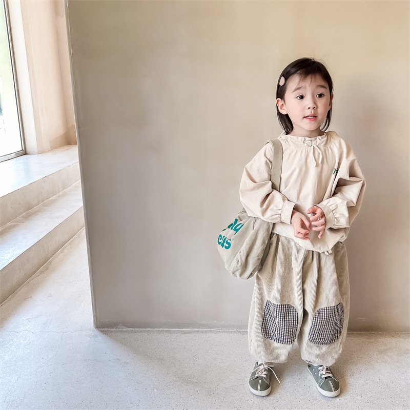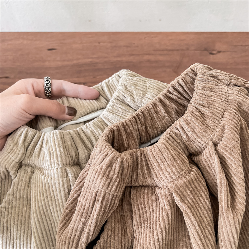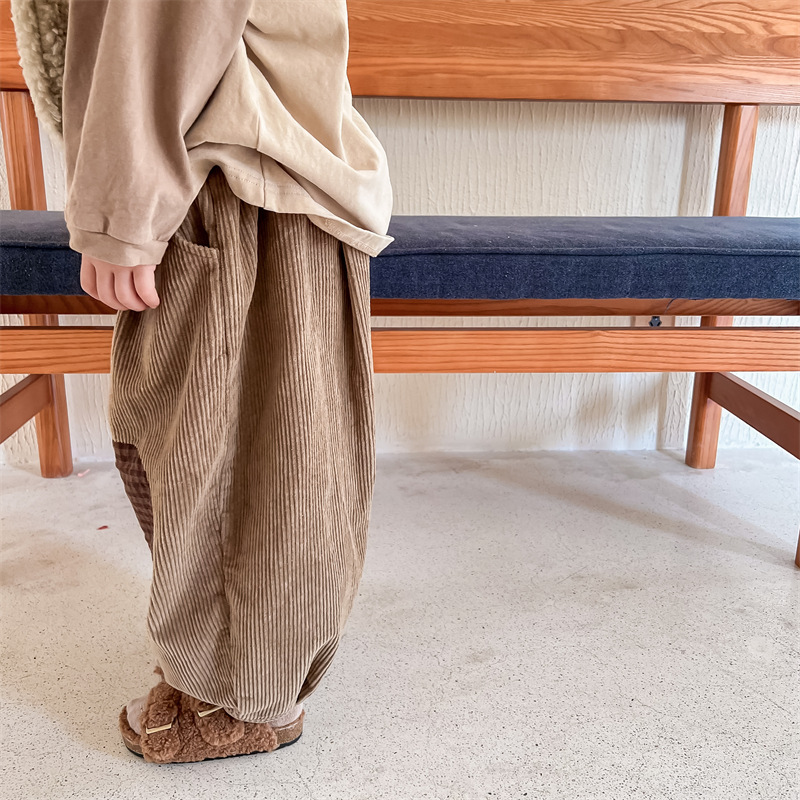 日系格子補丁條絨長褲